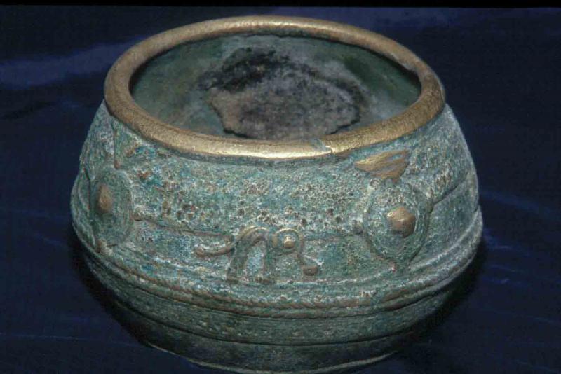Beschreibung: Ein Messbecher, man genannt, der speziell zum Abmessen des Reises verwendet wird. Eine ebenfalls man genannt damit abgemessene Einheit umfasst etwas weniger als ein halbes Kilogramm Reis. Dieser alte Messbecher zeigt als Verzierung einen Elefanten und damit auch die Beziehung zu Lakshmi als Reisgöttin, die auf das engste mit diesem Tier als ihrem Träger verbunden ist.